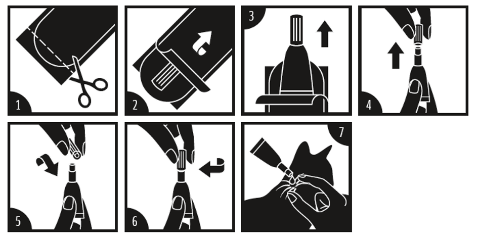 Verwenden Sie eine Schere (1), um die kindersichere Blisterpackung zu öffnen. Die Folien auseinanderziehen (2) und den Tropfapplikator aus der Packung nehmen (3). Den Applikator in aufrechter Position halten (4), die Kappe drehen und abziehen (5) und das entgegengesetzte Ende der Kappe zum Aufbrechen des Siegels verwenden (6). Das Nackenfell der Katze an der Schädelbasis scheiteln, bis die Haut sichtbar wird (7). Die Spitze des Applikators auf die Haut setzen und den Applikator mehrere Male fest drücken, um den Inhalt direkt auf die Haut zu leeren (7). Ein Auftropfen an der Schädelbasis verringert die Möglichkeit, dass die Katze die aufgebrachte Lösung ableckt.
