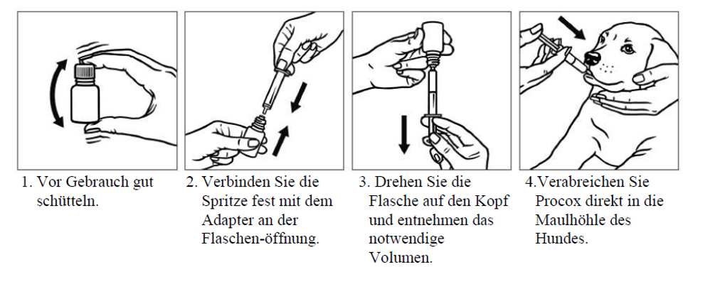4. Verabreichen Sie Procox direkt in die Maulhöhle des Hundes. Entsorgen Sie die Spritze nach der Behandlung, da eine Reinigung nicht möglich ist.