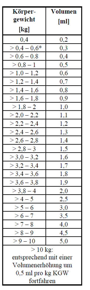 Empfohlene Volumina sind in der unten angeführten Tabelle aufgelistet: