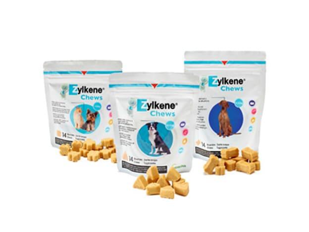 Zylkene Chews enthalten einen Inhaltsstoff natürlichen Ursprungs mit bekannten entspannenden Eigenschaften, welcher aus dem Milchprotein Kasein gewonnen wird. Zylkene Chews sind schmackhaft und einfach zu füttern. Füttern Sie Zylkene Chews an Hunde, um Ihnen zu helfen, neue oder stressige Situationen wie Veränderungen des Umfelds, Umzug in ein neues Zuhause, Tierarztbesuch, Familienzuwachs oder ein neues Haustier, Absetzen, Reisen, Feuerwerk oder für alle Situationen, bei denen die Routine Ihres Haustieres verändert wird, leichter zu bewältigen.